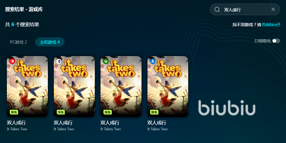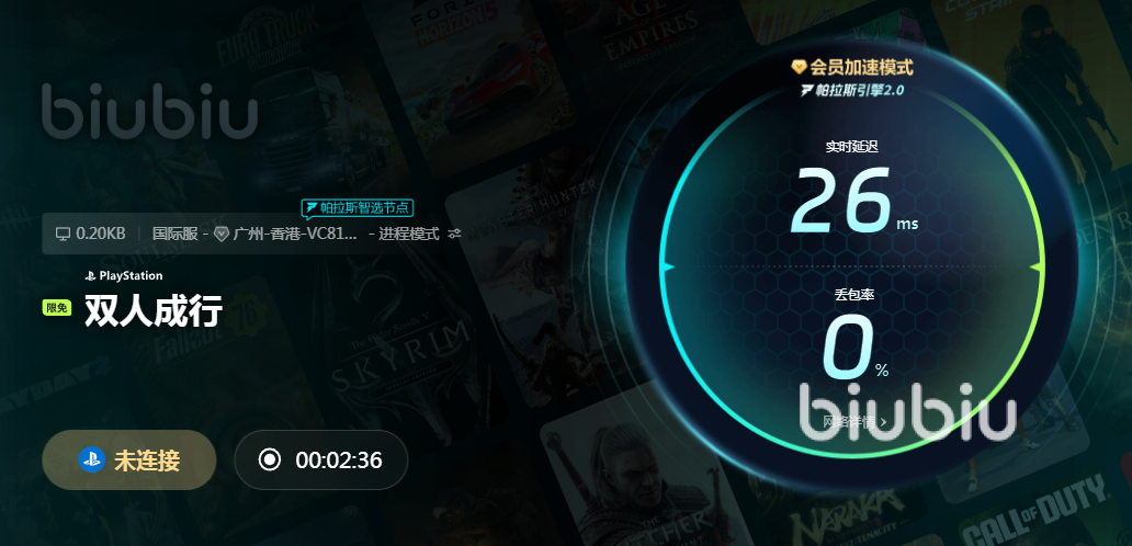 biubiu的加速效果是会同步上传的,大家不管是玩PS5还是steam都能享受加速后的网速。现在平台还给所有新用户赠送3H免费加速,就拿双人成行游戏来说,biubiu除了端游资源以外还有PS5资源,并且开放了主机加速的免费权限,大家也可以通过【biubiu不卡顿】来领取三天免费加速,这样全站游戏都能轻松畅玩了。