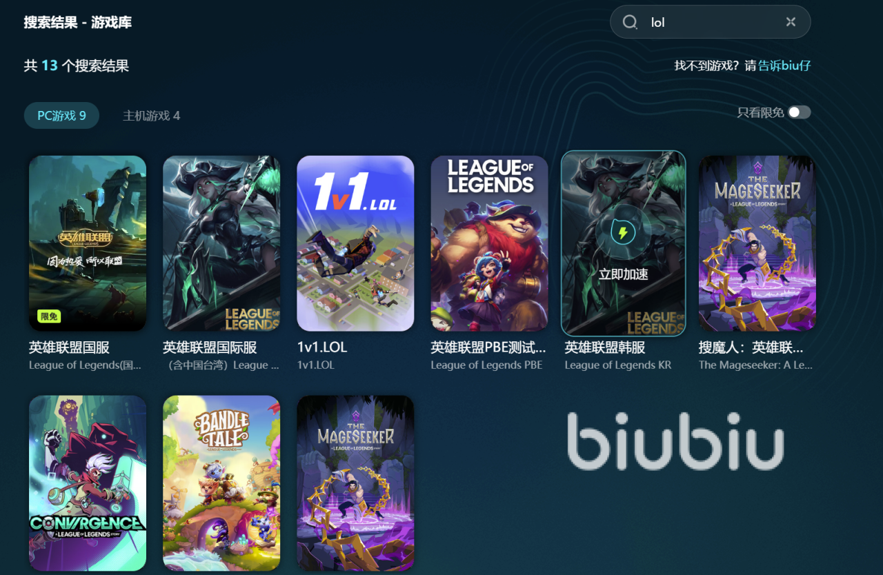 游戏有着事多年的历史了,但是就算时间如此久远大家对于它的喜欢仍然都没有减退,一亿活跃玩家的峡谷对战中,每一场赛事都吸引了超多的观众,就算是国外也同样疯狂受欢迎,但是不管是国际服还是国服,对于网络的情况都是很高的,一旦出现了干扰的问题,就会让大家的体验大大折扣,心情和游戏进度同样被影响着,比如打野或者是对线的时候一个小细节,就很难触发特效,而这个时候一款好用的加速工具是十分重要的,而biubiu就是这样存在着。