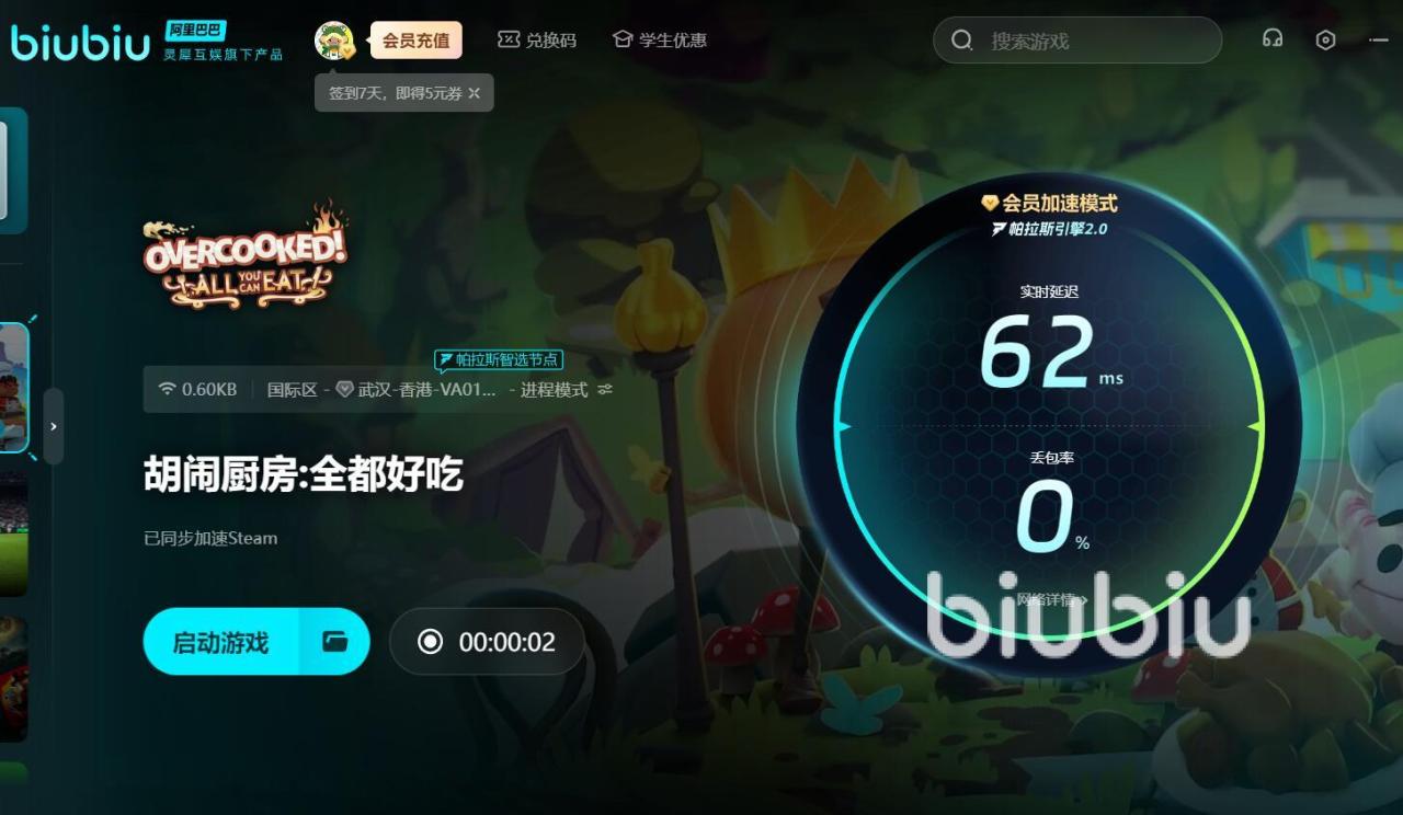 在胡闹厨房里面,玩家要在规定时间内完成切菜、做菜、洗盘子等动作,刚开始的时候难度还不算高,但随着游玩的深入,需要玩家更快地完成各项操作,才能拿到三星并成功通关。如果你是联网去玩的话,网络的稳定度对比赛有很大的影响,如果你不想被高延迟干扰,那么可以在开玩前,用biubiu去优化一下线路,应用中的帕拉斯引擎能有效降低延迟、丢包率,为你的游戏之旅保驾护航。要是你对biubiu不了解,那么可以先试用一下,新用户注册成功后,就能免费试用3小时。除了这个福利外,平台还给所有用户准备了兑换码,在软件内输入【biubiu不卡顿】后,就能得到三天的会员。
