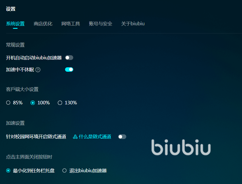 biubiu性能十分稳定,能够确保长时间运行也不会自动断开自动掉线,只要用户不关闭加速,那么就会一直运行下去。而且它还有不休眠模式,支持开机自动打开biubiu,节省很多操作步骤,经常玩游戏的小伙伴用起来特别顺手,加速效果也能达到电竞级别,大家不管在什么地方玩游戏都不再担心延迟和闪退了。