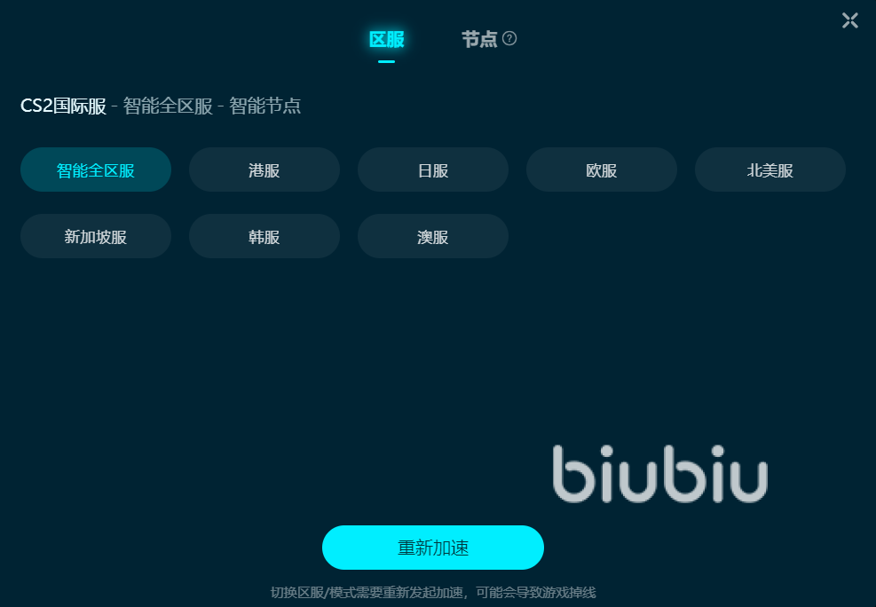 强大的biubiu支持cs2多平台加速。无论你是PC还是主机玩家,都能通过biubiu享受到畅快的加速体验。你可以根据需求选择国服、国际服、或者特定区服的加速,提供细致入微的选择,每一场对战都能尽享无延迟、不卡顿的畅快感。比如小编点击了国际服,如果没有特定要求就可直接选智能全区,如果想对某大区进行精准的优化,大家按需点击即可,用法非常简单。