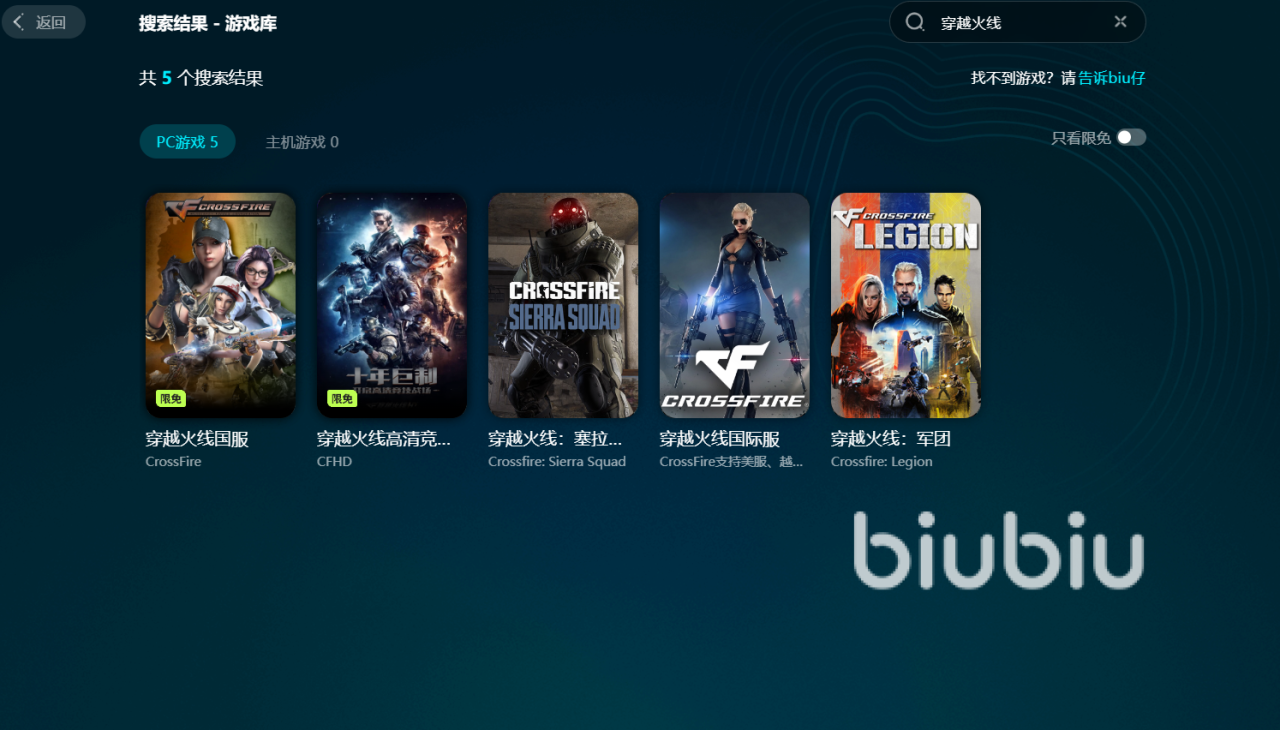 使用biubiu加速器后,首页键入“穿越火线”的关键词,就能一目了然地搜到有关的游戏,大家根据自身所玩的一项,点击对应图标即可,比如小编选好国际服,一点击就能进入。
