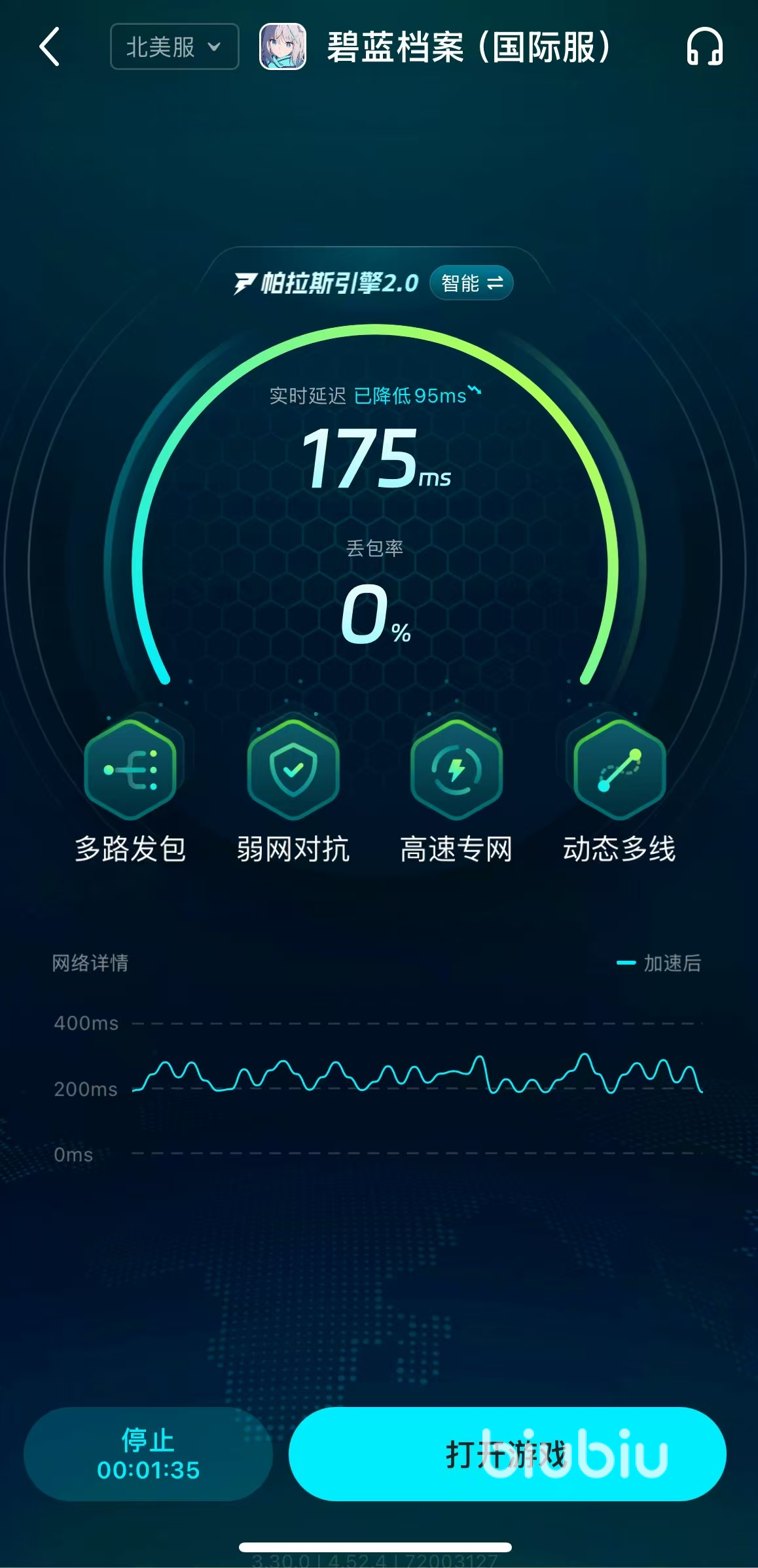 biubiu采用多路发包的方式加速游戏,专业线路高效对抗弱网,网速变化是动态的随时都可以查看的,加速以后通过网速曲线就能明显看到它的变化。在加速页面的左上角还可以实时切换服务器,有需要的小伙伴只要动动手就能感受无感切换。