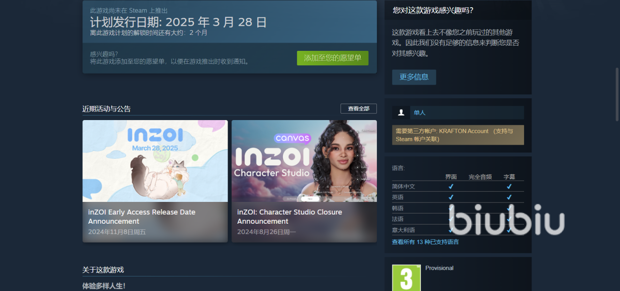 日前,Inzoi的Steam页面便已经开放,早期游戏暂不支持中文,发售日期待定,而在最近游戏也早已定下来发售日期,同时我们发现商店页面里,游戏支持的语言中也是多了中文这一选项。