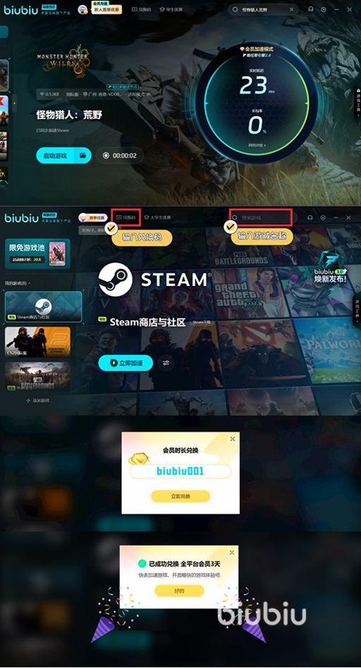 怪物猎人荒野作为一款PC端的游戏对网速要求还是非常高的,建议玩家们可以下载一个biubiu加速器,而且新用户注册免费加速时长可达3小时,利用biubiu001这个兑换码也可以解锁72小时的免费加速时长,75小时免费的加速时长等你体验。