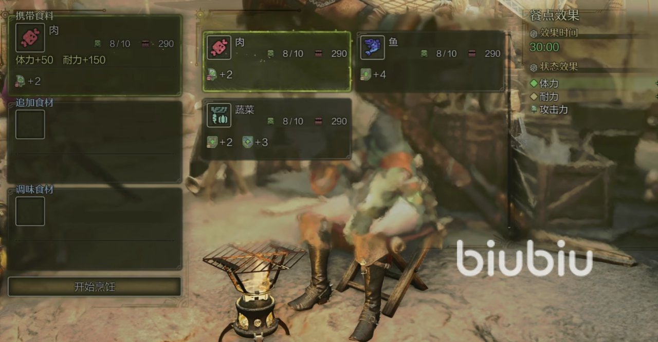 第二个模式是玩家自行烹饪,如果玩家的烹饪点数已经达到了对应食材所要求的点数,也可以在营地之中,生火做饭,但这种方式并不存在有任何CG动画的奖励,建议玩家一旦获取了珍惜食材,就直接前往猫饭屋之中吃猫饭。