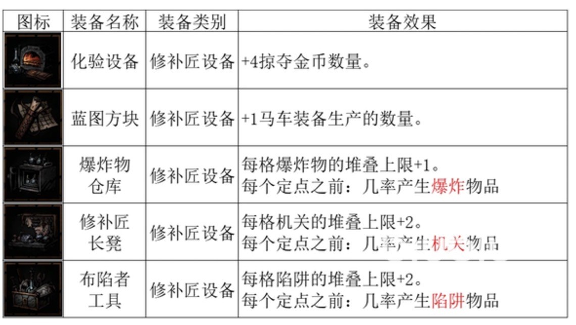 而修补匠设备是机关类物品的主要生产渠道。该设备专注于制造针对敌人的战斗道具,其中包括机关类物品。与医疗类设备相比,修补匠设备通常单一设备即可完成机关类物品的生产,无需复杂组合。部分机关类物品支持堆叠效果,如装备布陷者工具后,可堆叠多层铁蒺藜等陷阱物品,提升战斗效率。在修补匠设备的加持下,一些原本只能携带一个的AOE类战斗道具可以一回合内多次使用,实现强大的战场控制。
