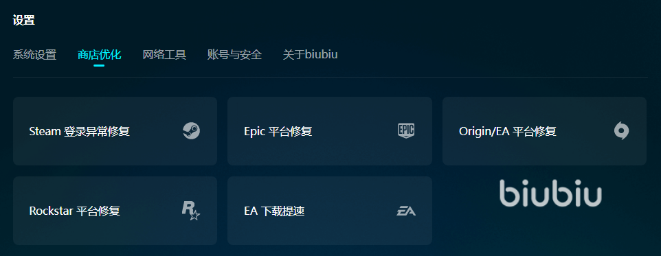 biubiu支持多样化电脑修复服务,修复游戏商店就是大家经常用得功能之一。它不光可以修复steam登录异常,还能对EA、EPIC等多个游戏平台进行修复。当大家发现这些游戏平台无法登录或者登录异常的话,就赶紧通过biubiu修复一下,不一会儿保准正常了。