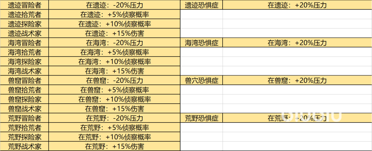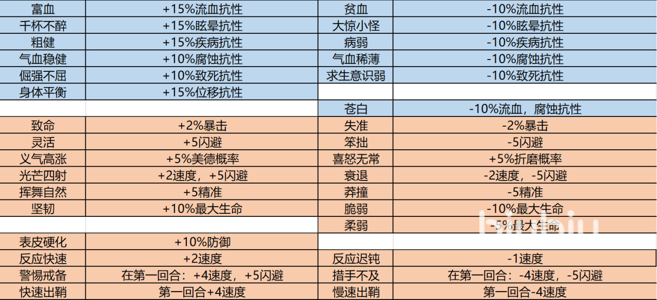 探险结束时,存活的英雄都有概率获得一个负面特质或一个正面特质。