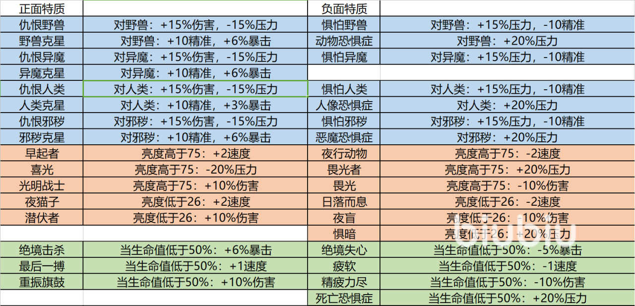 一个角色最多可以具有十个特质,五个正面和五个负面。