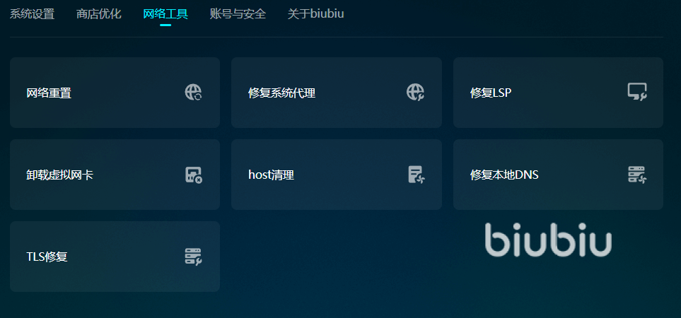 除了加速以外,biubiu还有其他功能呢,它可不是一个单纯的游戏加速器,还兼职上了电脑修复高手。如果有加速异常和网页登录异常这些情况,都能通过biubiu修复它们,进入工具箱里找到对应的工具,一键修复就搞定了。