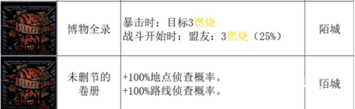 在这个游戏当中,是有很多道具的,提供给玩家们各种能力。比如说在陌城的时候,我们通关章节boss,就可以拿到博物全录,在暴击的时候给目标施加3点燃烧,也能获得未删节的卷册,提高100%的地点跟路线侦查概率。