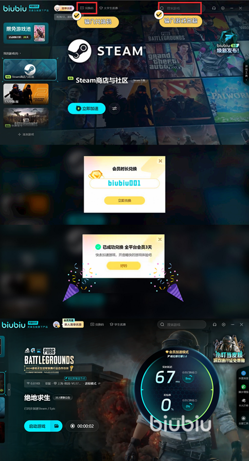 想要用好点的加速器,那就来试试biubiu加速器吧!刚注册的新账号,简直是游戏玩家的福音!一注册就能立刻领取3小时免费加速,轻松解决闪退困扰,让游戏运行顺畅无比。更棒的是,使用兑换码【biubiu001】,就可以立即得到72小时的免费加速时长,完全没有任何门槛。至于新用户,福利更加丰厚!叠加兑换码后,总共可享受75小时的超长加速时长,告别卡顿,畅玩不停!