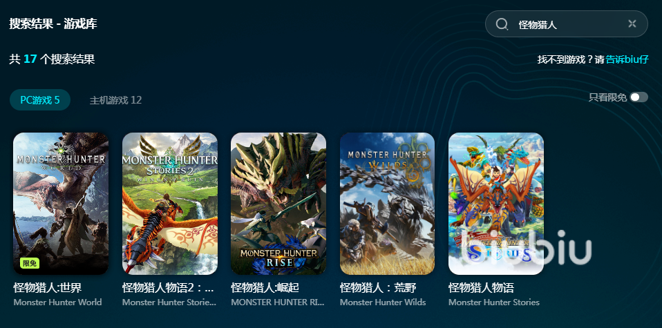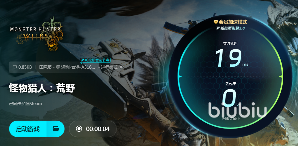 biubiu加速器可以加速怪猎所有系列,软件里一共有17款怪物猎人游戏的加速资源,不管是端游还是主机游戏应有尽有,就连最新的怪物猎人荒野也能直接在站内加速。biubiu给所有新用户都发放3小时免费加速时长,要是你错过了新用户福利,现在也能使用【biubiu不卡顿】兑换到3天免费加速,新用户也支持兑换一次哦。