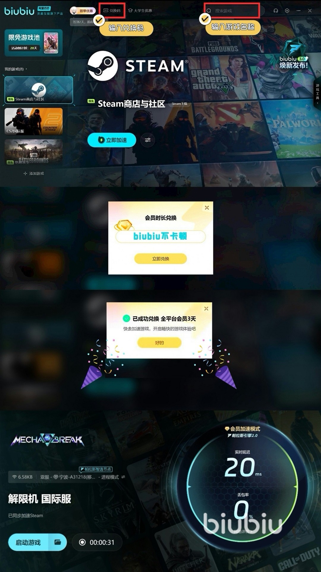 游戏的测试资格申请方法是比较多的,小编第一个为大家介绍的方法是在官网申请,玩家可以登录解限机的官方网站进行申请,小编建议大家可以先下载biubiu加速器,用这款软件优化网络连接后,再访问官网完成预约申请,大家记得填上自己经常使用的邮箱,因为测试资格的通知会发至玩家的邮箱。值得一提的是biubiu加速器有很多福利活动,新人第一次注册软件,可以得到3小时的免费加速体验,再使用【biubiu不卡顿】获得72小时的免费加速体验,兑换码是新老用户均可使用的,但是只能用一次。