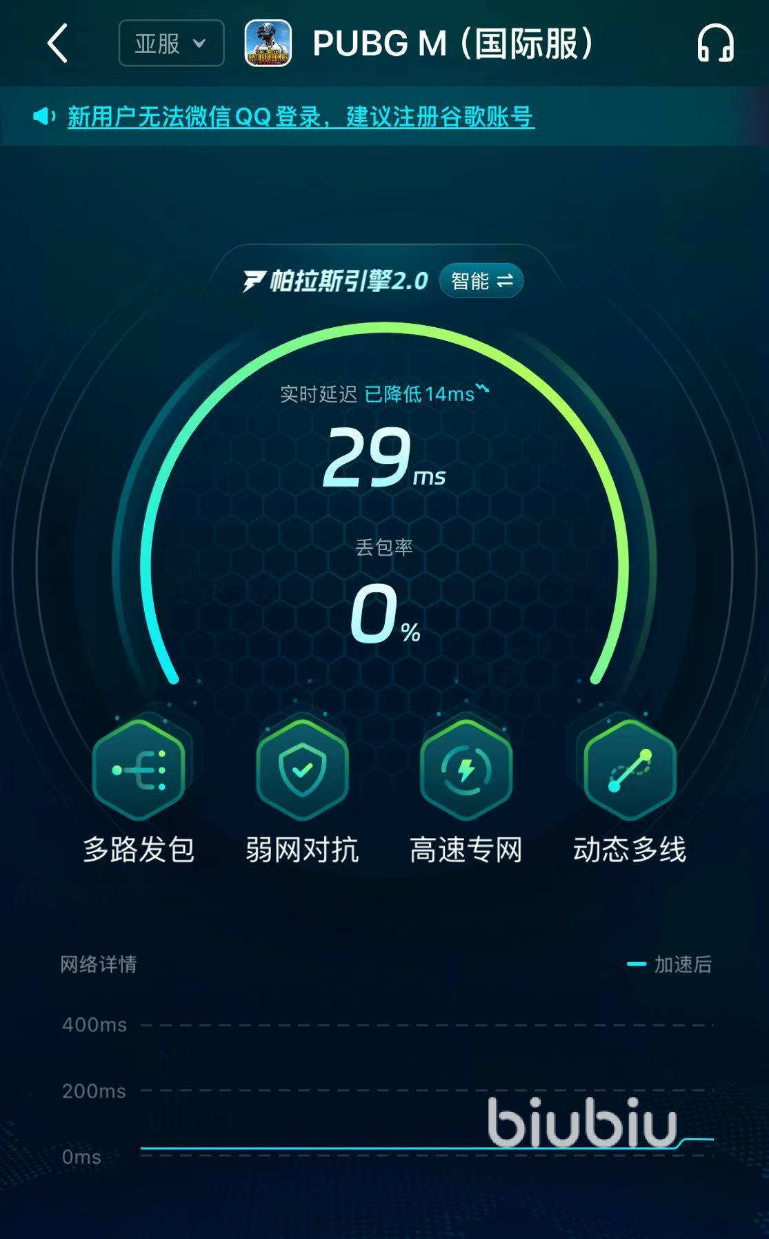 pubgM也是考虑到玩家的体验,将第一人称视角作为游戏视角,排位的时候最多支持4人同排,给玩家满满的安全感。当然也有一些玩家选择了单排,跟路人配合的时候难免遇到沟通上的困扰,其中网络卡顿就会让大家沟通起来很费力。现在用biubiu加速过游戏以后,玩家玩起来也能更加专注,沟通的时候不那么困难,所有的语言和标记都能马上传输给队友。