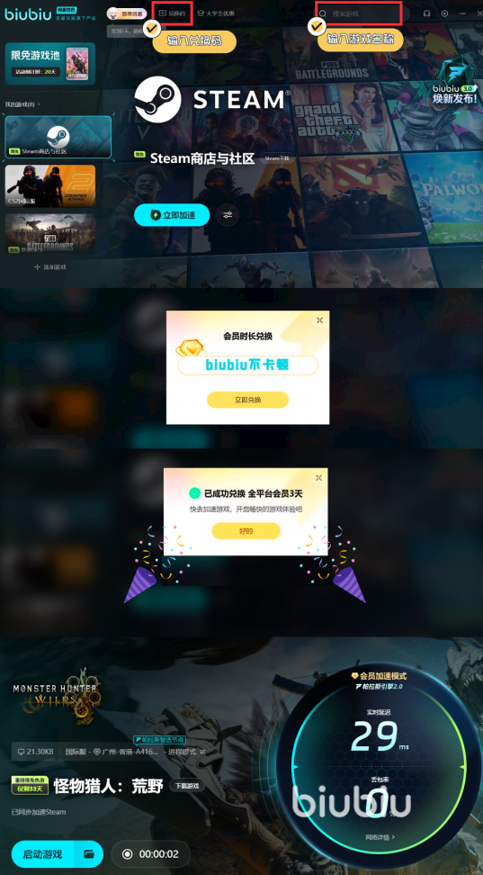 游戏最新的下半期二测时间为2025的2月14日到2月17日,正式发售时间为2月28日,到时候大家用biubiu加速怪猎可以畅玩不炸房,并且在2月7日-17日可以限时免费加速,同时在这期间还有抽奖活动,大家有机会拿到游戏本体、实物周边奖励和最高365天的加速时长,邀请自己的好友可以多抽奖一次,每天0点会重置加速任务,此外使用兑换码【biubiu不卡顿】还可以再得3天的免费时长。