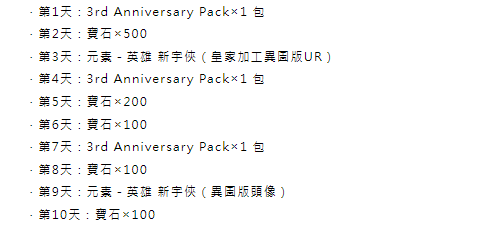 到了第四天又可以拿到3rd Anniversary Pack×1 包,第五第六天分别是200宝石以及100宝石,第七天继续得到一个礼包,第八天再拿100宝石。第九天领取新宇侠英雄的头像,第十天再送我们100宝石的。