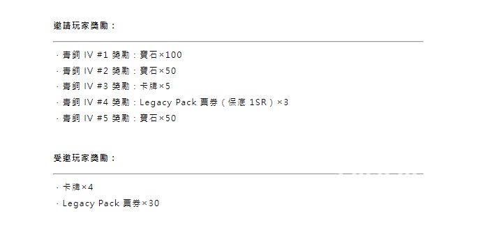 这次活动还很适合老玩家回归了,上面是正常奖励,如果是两星期以上没有玩的老玩家回归,还会有套牌奖励,另外如果邀请青铜玩家,还能够拿到额外的宝石奖励了,受邀回归玩家也有卡牌获得的。