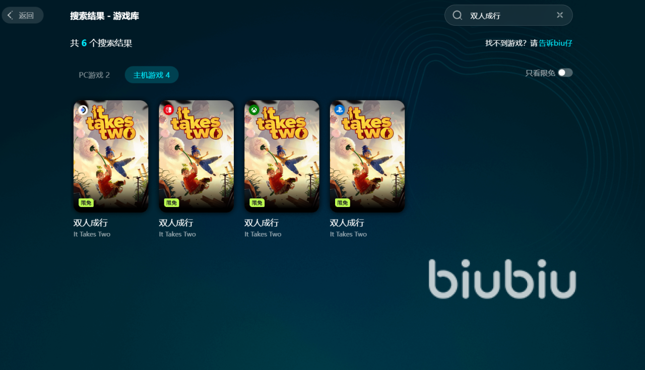 而且值得一提的是,强大的biubiu支持《双人成行》的PC、多款主机平台上的加速,大家可以在搜索页面上自选喜欢玩的平台,还能分享给好友一起使用高效通关。同一个会员账号,就能在主机上体验同样高质的智能加速、低延迟、稳定不掉线等特色,感受它的独特魅力。