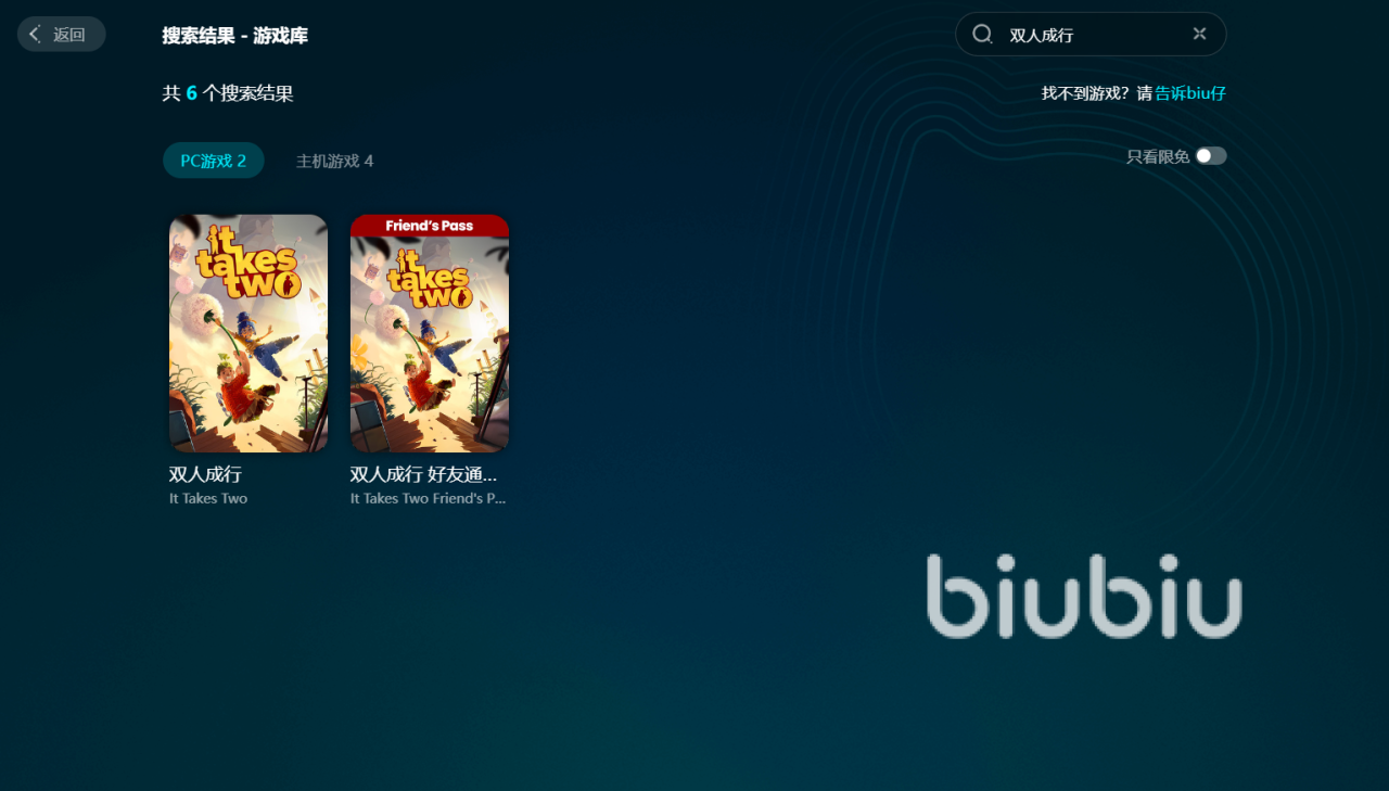 登录biubiu平台后,操作非常简单。你可以通过搜索快速找到自己想玩的“双人成行”,还有好友通行证的专用,大家也可以到游戏库探索其他类型的游戏。选好游戏后,一键启动加速就行。