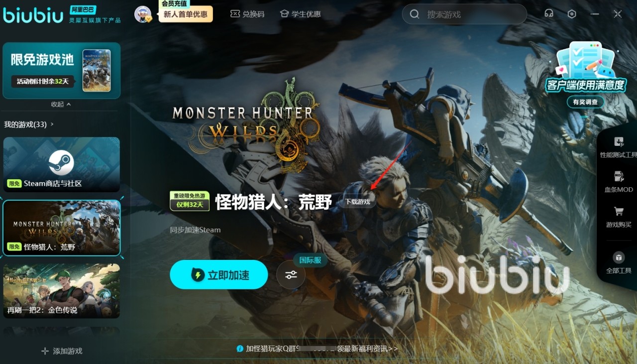 还有一种方法是直接利用加速器,现只要通过biubiu加速器加速怪猎游戏避免不炸房,另外还有免费加速时长可以领取。例如新用户最高可以累计免费75小时,在第1次注册可以免费3小时。另外还可以在加速器的页面复制口令【biubiu001】延长72小时的免费加速时长。从2月7号开始到2月17号,玩家不仅可以参与抽奖活动,还可以享受限时免费加速活动。进入抽奖活动里面,玩家可以有可能获取实物周边奖励、游戏本体还有最高365天的加速时长。