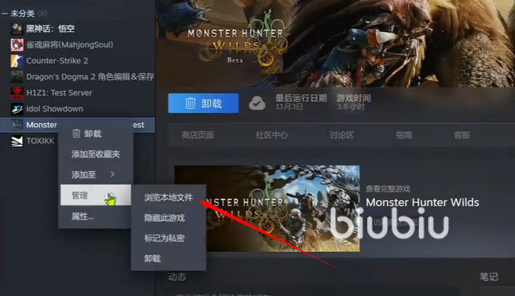 打开Steam客户端,右击《怪物猎人:荒野》游戏图标,选择“浏览本地文件”。
