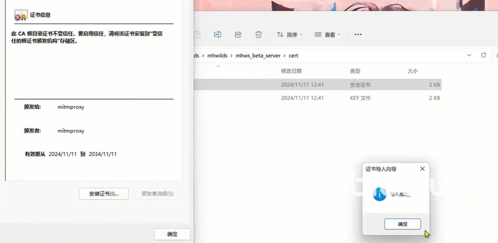 首先,确保你已经准备好了最新的mhwilds工具。接下来,进入mhws_beta_server\cert目录,然后双击root.crt文件,并按照提示点击“安装证书”以完成证书的安装过程。成功后,会弹出“导入成功”的提示框。