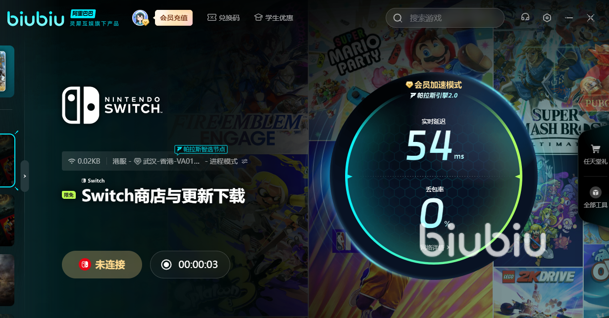 由于switch平台的网络不够稳定,偶尔也会出现无法进入的情况。这时就可以用上biubiu,加速过后,就能直接快人一步进入商店中浏览你所喜爱的佳作。新用户的话可获得3小时的免费加速,然后新老用户输入【biubiu不卡顿】,又能额外领取三天免费加速。如果体验一些动作型游戏时太卡,那就无法顺利出招,也不能躲掉其他怪物的致命一击。用上加速器后,自然可轻松躲避迎面而来的危机,并适时地反打,还能击杀对手。