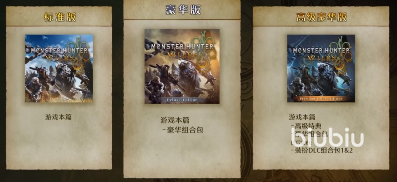 豪华版可以获得额外的猎人和宠物外观,而高级豪华则是多了两款额外的外观和dlc通行证,分别会在游戏发售后的春夏两个季节推出,对于普通玩家来讲选择标准完全够,豪华版的猎人皮肤不见得符合大家的审美,通行证的皮肤还要花时间去刷,而前两个作品其实好看的皮肤还得要单独花钱购买,相比之下还不如刷活动皮肤性价比高。