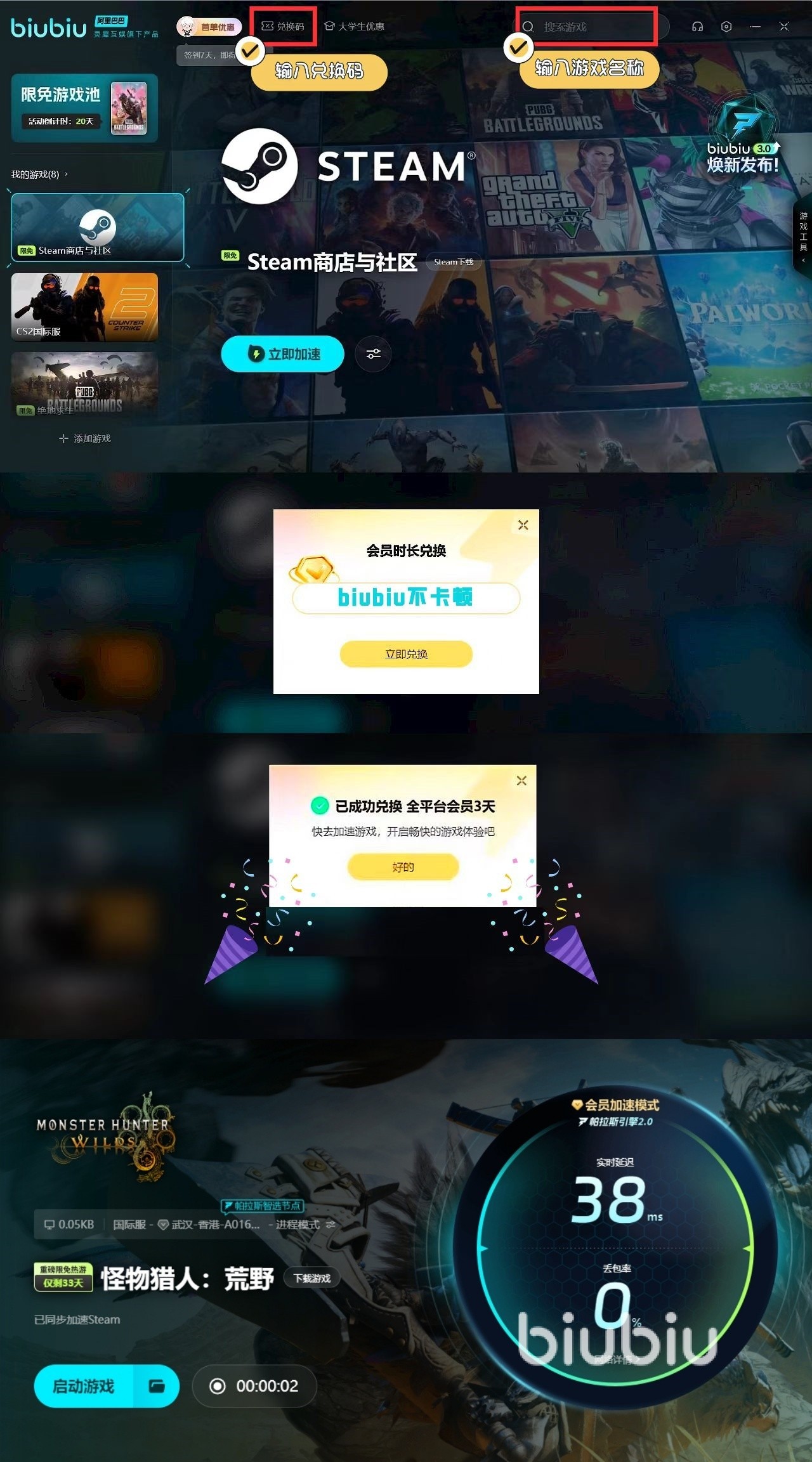 而在捏身材的过程中,如果大家的网络不够流畅,就有可能会导致创造失败或者是战斗无法顺利进行,这里小编就建议大家使用biubiu加速器来进行稳定网络状态,对于新用户biubiu也是会送上3小时的免费加速时间,如果玩家们想要进一步体验,还可以直接输入【biubiu不卡顿】这一兑换口令,再额外换取3天的免费加速机会,能够有助于大家更好的完成游戏竞技。而且针对怪猎biubiu在2月7日到17日之间是可以限时免费加速的,同时,在活动期间,玩家们也是可以参与抽奖玩法,抽奖的奖品包括了游戏本体、实物周边奖励、还有biubiu加速会员时长等等,会员时长最高可以抽取到365天,想想也是比较给力的。在使用biubiu进行加速之后,玩家们在体验游戏的时候都能实现不炸房、流畅玩,让我们的战斗变得更加顺利。