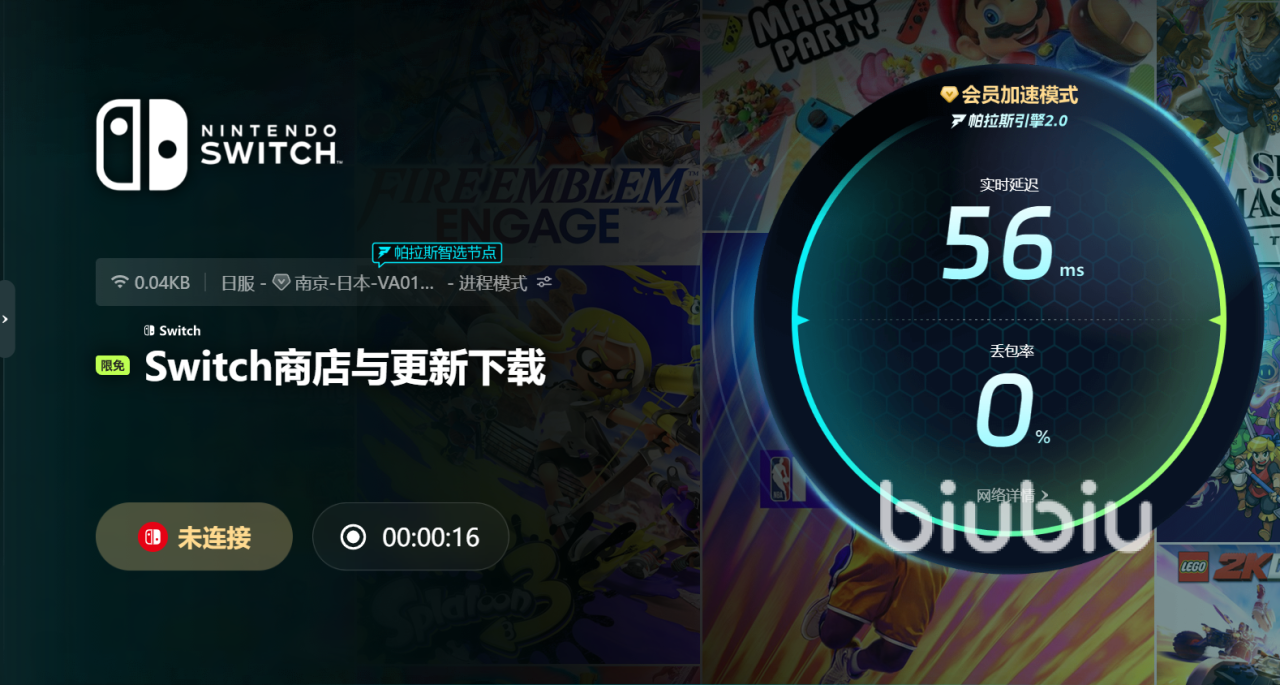 switch平台的一部分游戏是需要经常联机的,而普遍联机的环境是比较糟糕的,很容易出现游玩直接掉线的情况,有时候严重一些这个平台都无法完成登录,这时候就可以使用biubiu加速器来改善网络环境,让加速器的加速性能得到进一步的提升,而且还可以支持平台内绝大部分的游戏,玩起来会感觉非常舒适,并且新人在注册后便获3小时免费加速,新老用户均可使用兑换码【biubiu不卡顿】可获3天免费的使用权哦!