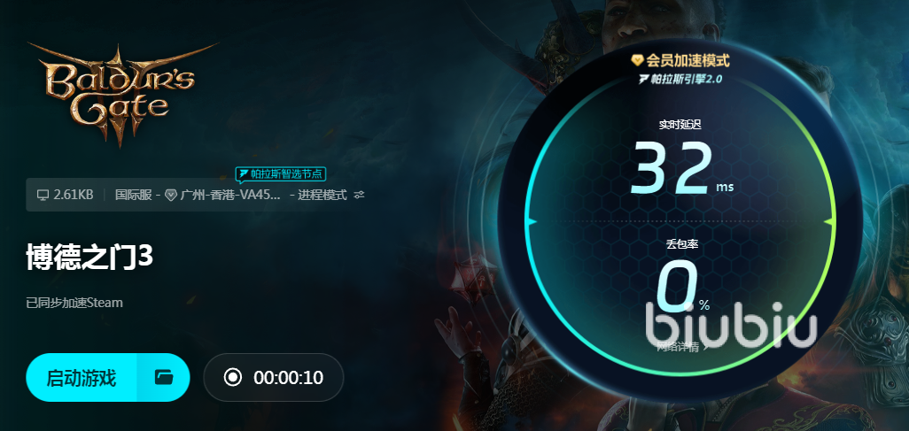 博德之门3游戏节奏比较缓慢,需要大家静下心来玩,用心体验里面的每一个细节,光是完成游戏引导就需要花上十多个小时,很多小伙伴游戏时间已经达到了100小时也才是入门级别。它庞大的世界观探索起来特别有趣,也支持四人联机跟好朋友好闺蜜一起来冒险。打开游戏之前如果能先用biubiu加速一下,就不会有延迟和卡顿的困扰了,不管是校园网络还是家庭网络它都能改善,提速效果特别明显。