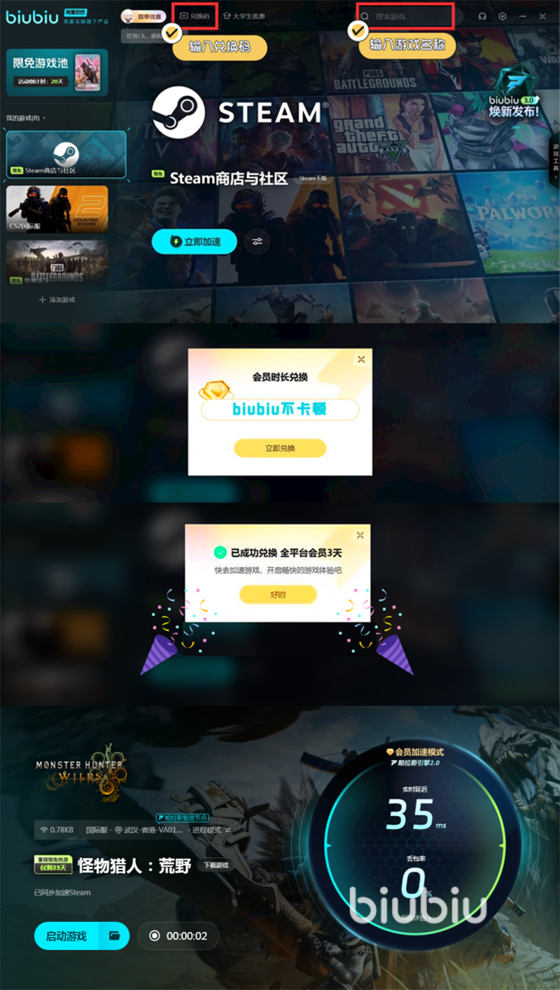 现在使用biubiu可以做到免费加速这款游戏,因为在2月7日至2月17日这一个时间段内,怪物猎人荒野这款游戏是属于biubiu的限时免费加速名单之内,也就是非会员用户也可以直接输入游戏名称,找到选项之后点击进行优化,不会受到其他限制。另外还针对这款游戏推出了抽奖活动,奖品超级丰厚,抽奖活动时间段也是在2月7日至17日,每天都可以在biubiu官网中进行抽奖。只需要每天使用biubiu对这款游戏进行加速30分钟,就可以获得一次抽奖的机会,邀请好友还能再获得一次额外的抽奖机会。抽奖获得的奖品有很多,例如有机会获得游戏本体,或者是获得游戏相关的周边奖励,以及biubiu的加速会员时长等。其中加速会员时长最长能达到365天,还有30天,1~72小时等奖励,如果感觉自己的运气足够好,一定要来抽奖活动看一看。