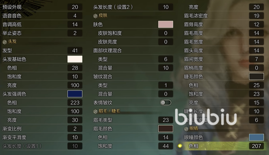 五官方面以小巧为主,眉毛方面的数据为23,色相为14,这样眉毛整体会看起来小很多,很符合凌波丽的个人形象,接着就是眼睛的数值,眼睛大小的数值为20,深度和宽带都为7,可以带个双眼皮,使得眼神看起来很大,但是却无神,这很有凌波丽高冷的气质,然后就是鼻子位置的数值为5,鼻子高度为9,这样跟其他的五官会比较匹配。