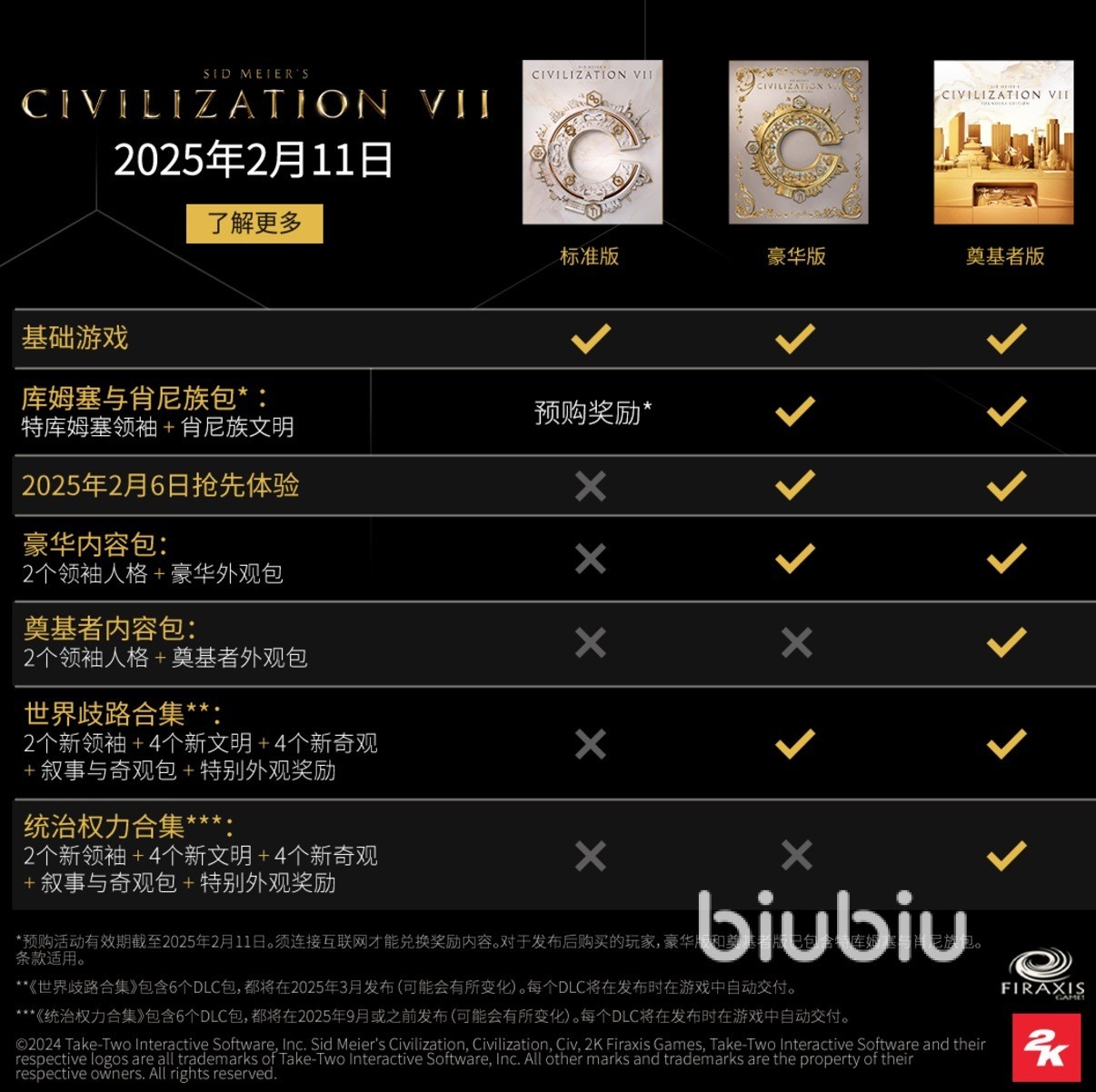 最后是奠基者版,价格为558元人民币,它不仅包含了标准版的所有内容,还加了一堆豪华和拓展包。新领袖、新文明、新奇观,应有尽有,让你玩得不亦乐乎。而且,这些额外的内容还会随着更新逐步解锁,让你总有新鲜感。不过,这个版是限时销售的,到2025年2月28日就截止了,想入手的得抓紧了。