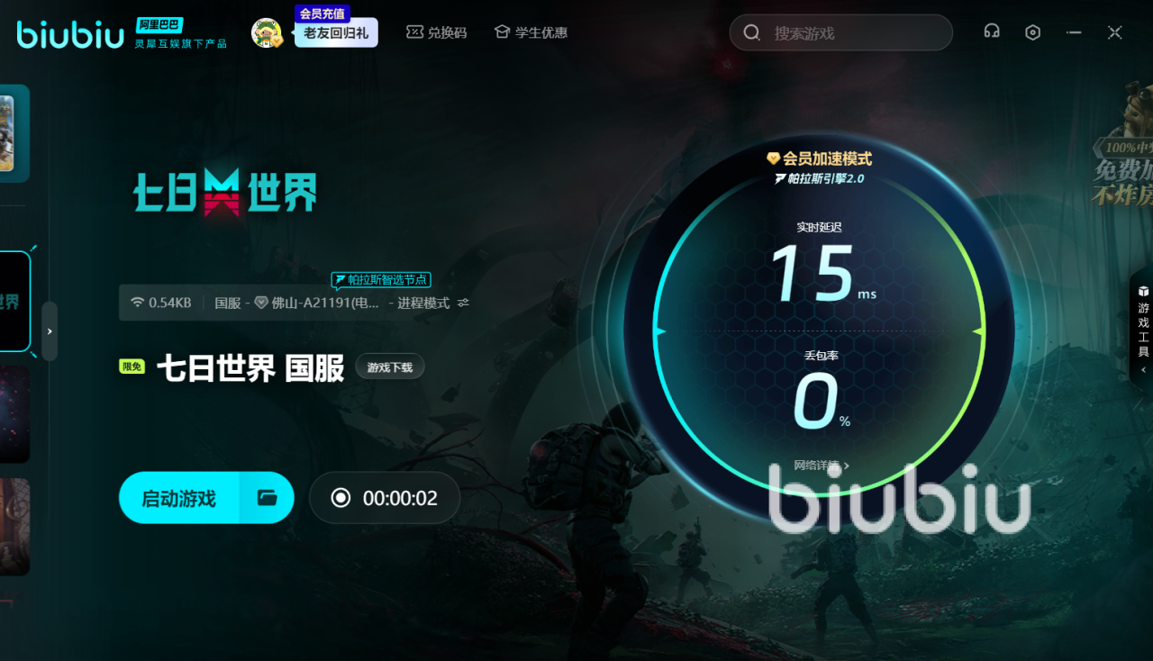如果你从未使用过加速软件,完全不必担心操作复杂。登录平台,在搜索栏输入“七日世界”,找到对应的游戏专区,轻轻一点“加速”按钮,瞬间就能告别延迟,开启流畅的游戏之旅。可以看到小编启动之后,实时的延迟值降到15ms左右,基本无丢包的情况。