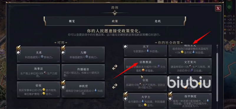 这里注意文明早早的发教,就是要拿到【宗教教派】和【理性主义】这两张超模政策卡,让你的科文、金币、幸福度,都加15%,实在是超爽的。