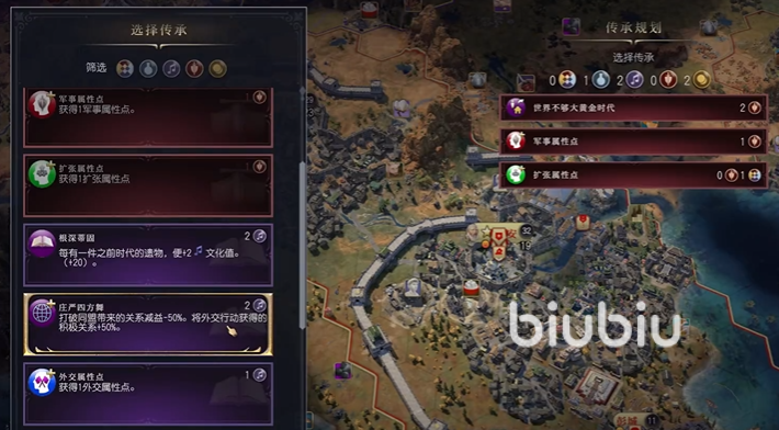 最后,在进入近世时代后,选择下面这些领袖属性点作为传承方向,并完成了军事传承的黄金时代效果。市政需要优先点出博物馆,出探索者考古,因为实现文化胜利需要展示15件文物。