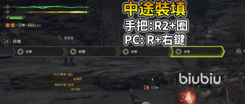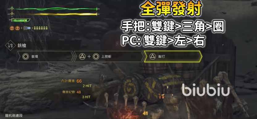 中途加弹大家可以快速用○或者↑,一般两三下就满了,这时候大家肯定想用蓄力攻击,虽然伤害高,但是4秒停顿时间实在是太久了。大家可以用↑跟○两个按键一起,使用出来上捞斩,然后接上↑键位进行敲打,接着使用○进行全弹发射,这样所有子弹就会快速的发射出去,打出来的伤害自然也就高了。