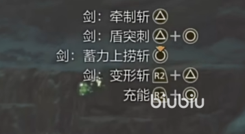 这是一个双形态武器,所以拥有的变化还是比较多的。举盾情况下就是剑形态了,我们是可以轻砍的,或者是用盾拖移动斩进行小跳攻击。这里我们使用↑按键就是牵制斩了,用↑+○就是盾突刺,在按R2的同时,用↑键就是变形斩,用○键位就是充能。小跳攻击则是需要我们在斩的时候按下摇杆进行移动,这样就可以实现位移攻击,更加的灵活了。要是想攻击更高,就可以长按○,这样就是蓄力上捞斩了。
