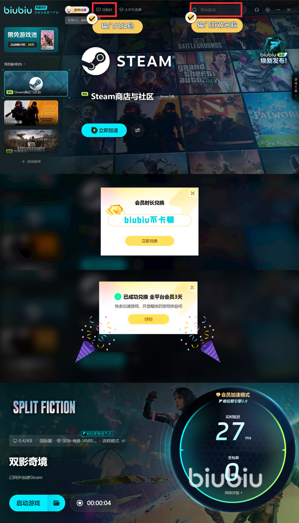 这边给小伙伴们推荐biubiu加速器,不仅能将数据传输的通道改善,而且能降低节点转换次数,提高利用的效率,能很好的解决卡顿的困扰。而且现在还有优惠活动,新人朋友注册处可获赠3小时免费时长,输入“biubiu不卡顿”能额外获取3天的时长。