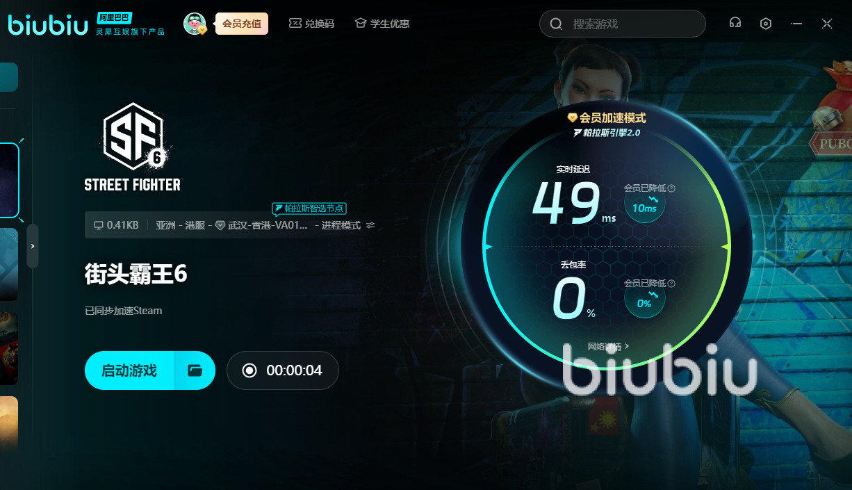街霸6还有一个特点,就是招式多种多样,要足够精准的操作按出正确的按键顺序,才能打出华丽的招数,而不仅按键要足够准,前后衔接时间也要够快,但是网络延迟一高就会影响系统的判定,会让本来可以成功释放的技能无法打出,biubiu有专家级的提速线路,能降低游戏丢包率,从而保证武技可以完美释放,而且新用户注册biubiu就能免费体验三小时,无论新老客户,在biubiu兑换界面输入【biubiu不卡顿】口令,还能再领3天的免费加速时间!