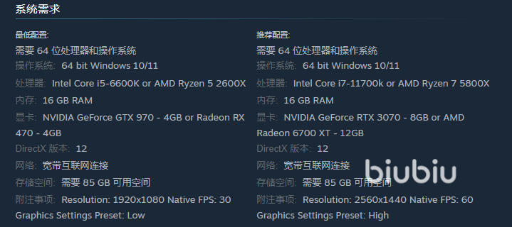 首先操作系统方面最低得是64位win10,低于这个可能游戏无法顺利启动,然后就是存储空间方面,建议预留85GB的空间,体量还是很大的,如今的游戏作品越来越大了。虽然没有限制必须要固态硬盘,但还是建议将其安装在固态上。