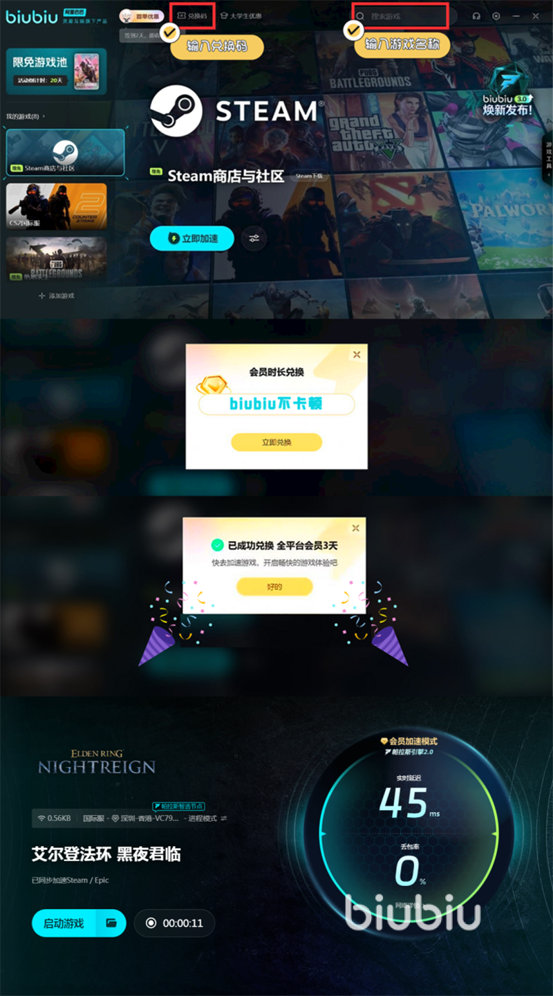 等到游戏正式发售之后,大家需要在steam平台中购买并且下载,biubiu加速器能够显著提升这一过程的效率,用biubiu去加速steam后,商店使用就会更加流畅,下载也会加速很多。Biubiu现在注册新账号直接送三小时会员时间,注册完毕就能领取,还有一项每个号都能用一次兑换码【biubiu不卡顿】,兑换得到三天会员时间。这样的免费试用福利,完全可以帮助大家更流畅地进行游戏。因为游戏是需要多人联机才能运行的,所以biubiu的优化功能对于获得流畅网络进行竞技是非常有帮助的。