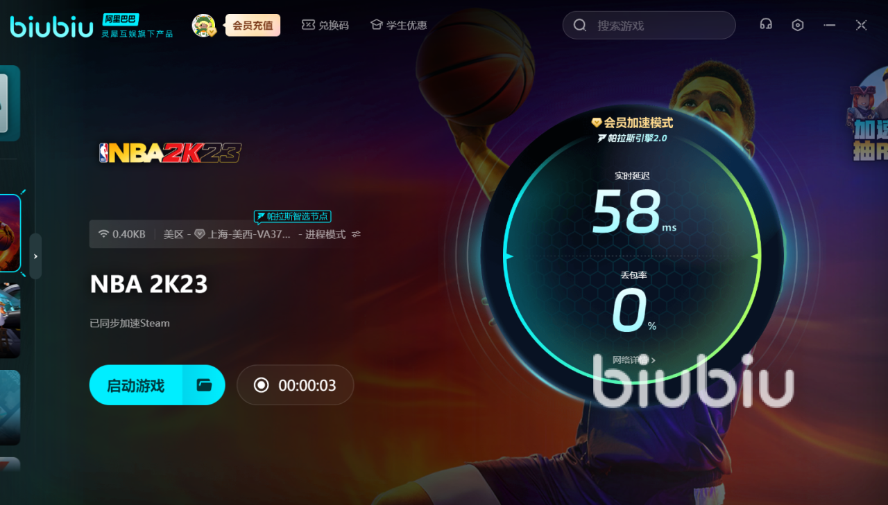 以上就是nba2k23画面卡顿怎么办的解决办法,小编今天就说到这里了,相信玩家们在游戏里听着王嘉尔的音乐,伴随着biubiu加持,不仅能帮助玩家解决网络烦恼,还能更丝滑地完成每一项投篮动作,是一款很实用还便宜的软件呢,喜欢这加速器的赶紧去浏览器搜索,去下载尝试吧!