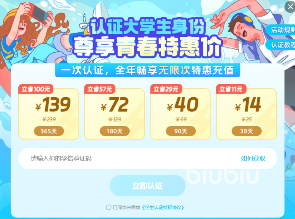 考虑到很多大学生囊中羞涩但又喜欢玩主机游戏,biu仔还推出针对大学生的专享福利,购买vip价格比正常的要便宜许多(最高达6折可省100元按/年),而且还是一场长期的活动。想获得优惠也很简单,通过客户端成功验证学信网身份信息就可以。