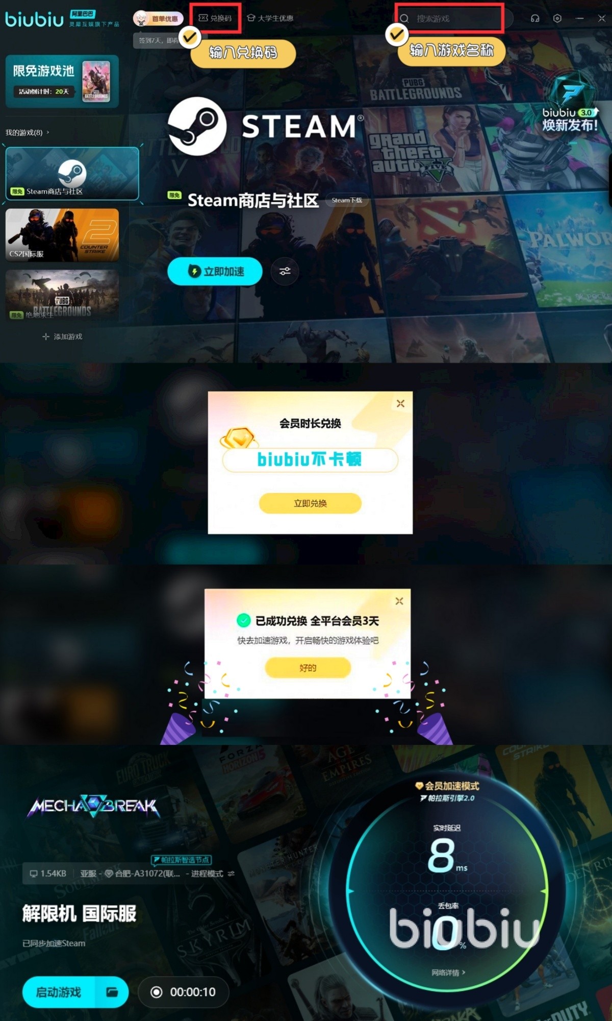 此外如果大家是通过steam去下载的话,那么在steam下载的时候,大家用biubiu也是可以给这个商店进行加速的,下起来的速度就更快了,下完了也可以用这个应用给解限机提速,玩得更加通畅。