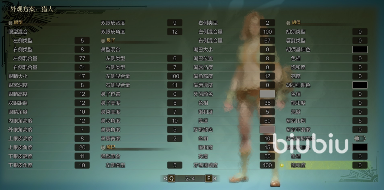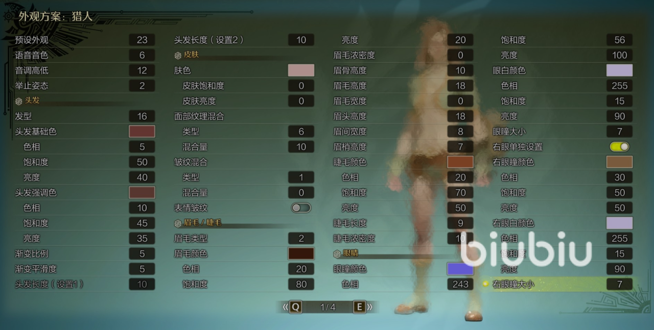 眼睛调整到17,然后高度跟双眼间距到12,鼻子高度到5,鼻梁高度到7,整个五官立体感就足够了。原角色有只眼睛是紫色的,不过一直被封印起来的,在怪猎里面没有这种功能,我们做到差不多就行了。