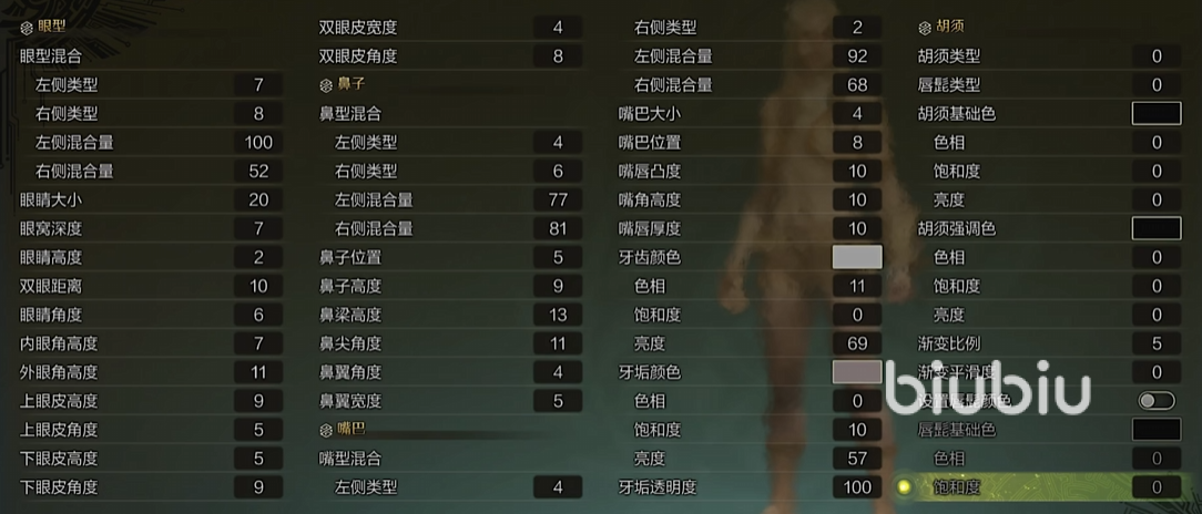 眼睛调整到20就很大了,然后深度为7,刚刚好,双眼间距10比较大气,眼皮高度以及宽度根据自己的审美来调整,喜欢含蓄一点就调窄一些。鼻子高度在9,鼻梁在13,就已经很高挺了, 鼻翼宽度跟角度都不要超过5,不然会显得笨重。嘴巴调整的小一点,选择粉色就很元气了。